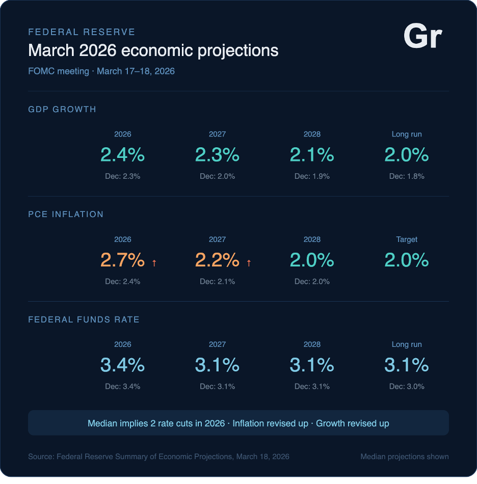 The updated Summary of Economic Projections (SEP) offers more detail on where Fed officials think things are headed. Compared to December's projections, the outlook has shifted modestly: participants now see stronger growth but also higher inflation in the near term.