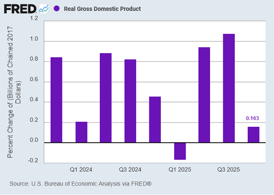 The headline number that should concern everyone: real GDP growth in Q4 2025 came in at just 0.16% quarter-over-quarter, which annualizes to less than 0.7%. That's not contraction — but it's uncomfortably close to the zero line, and it represents a sharp deceleration from the stronger growth the economy posted earlier in 2025.