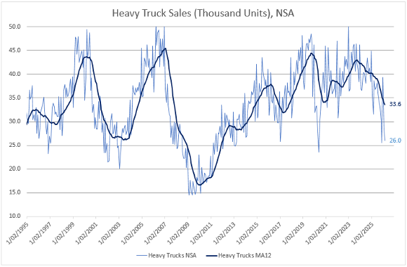 If GDP and the coincident index tell us where the economy is right now, transportation indicators offer a window into where businesses think it's headed. Heavy truck sales have been declining, with seasonally adjusted figures falling well below recent peaks. Businesses buy heavy trucks when they expect to move more goods; when orders fall, it signals that companies are anticipating less demand ahead.